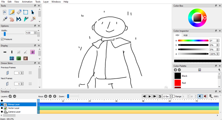 Интерфейс Pencil 2D простой и удобный, программа постоянно дает подсказки и не дает пользователю запутаться в функциях. Как и Blender, это ПО с открытым исходным кодом, а значит, его постоянно обновляют сами пользователи и добавляют в него полезные новые инструменты.