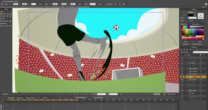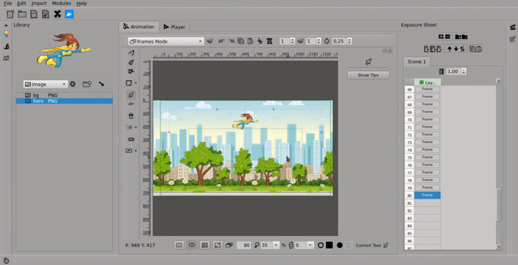 Moho поддерживает работу со слоями и покадровую обработку. Здесь есть встроенная библиотека базовых рисунков и готовых персонажей, графический редактор, а также опции имитации плавных движения.