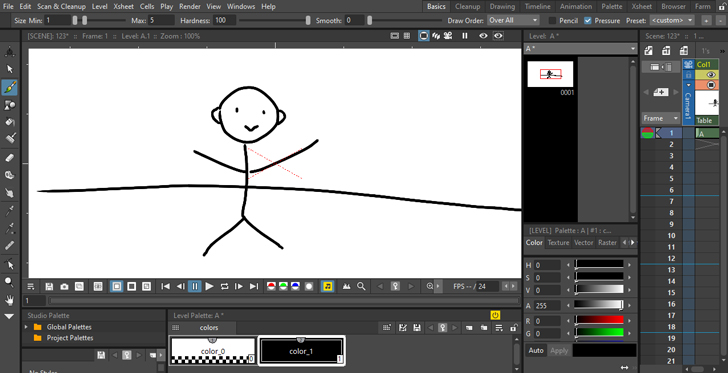 Pencil 2D – хорошая программа для создания анимации для начинающих. Во-первых, оно бесплатное. Во-вторых, здесь есть все необходимые инструменты для того, чтобы научиться создавать векторные и растровые изображения и анимировать их.