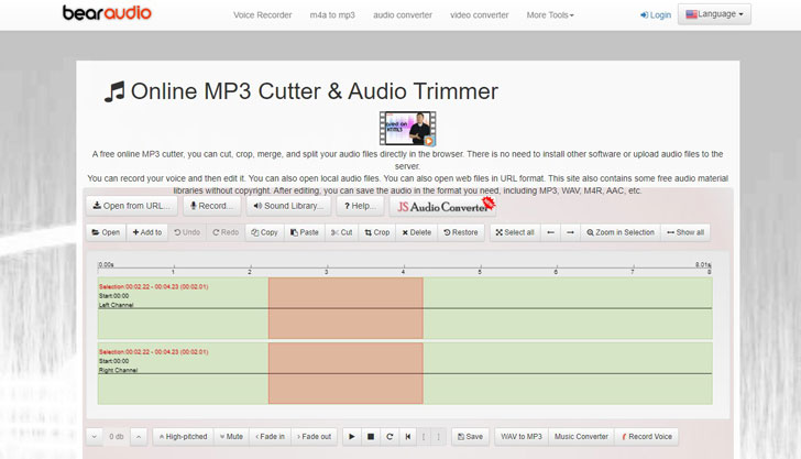 Отличный помощник для быстрого редактирования музыки в интернете – загружать медиаконтент на сервер не нужно. Преимуществом Bear Audio Tool является то, что медиафайл можно скопировать через URL-ссылку. Запись голоса на подкасты тоже предусмотрена.