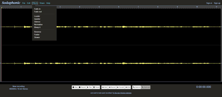 Простой в использовании, но от этого не менее функциональный аудиоредактор. Здесь можно вырезать лишние фрагменты записи, ускорить или замедлить звук, а также наложить дополнительные эффекты. Кстати, TwistedWave Online содержит в себе VST-плагины для обработки аудио. Свои добавить нельзя, но программа предлагает неплохой базовый набор.
