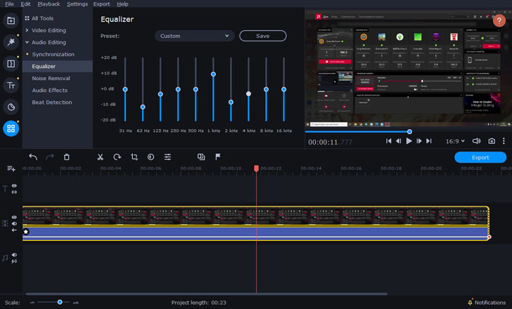 Самый удобный и экономичный вариант: выбрать мультимедийную программу, в которой можно работать с разными типами контента – в том числе со звуком. В этом смысле Movavi Video Editor Plus – один из лучших вариантов: помимо видеомонтажа, в нём можно делать качественную обработку звука. Спектр инструментов для обработки аудио – довольно внушительный: можно настраивать эквалайзер, устраненять шумы и накладывать разнообразные аудиоэффекты из встроенной галереи.