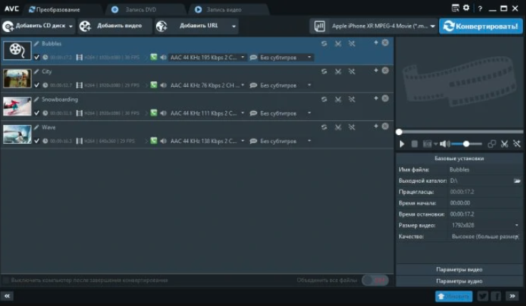 Бесплатная версия популярной и удобной программы. Any Video Converter поддерживает широкий пул видео форматов, в том числе MP4, WMV, AVI, MOV и другие. Конвертирует файлы для iPhone и смартфонов на базе Android, а также HD видео.