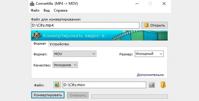Удобная программа с лаконичным набором инструментов. Если вам не нужны дополнительные функции вроде наложения субтитров или записи видео на диск, то Convertilla поможет быстро выполнить задачу.