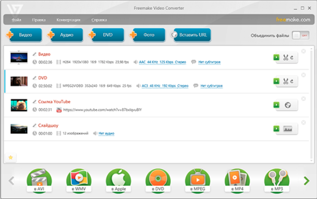 Freemake – отличный бесплатный конвертер видео. Приложение позволяет конвертировать видео всего в пару кликов – загружаете файл, выбираете конечный формат и нажимаете кнопку «пуск»! Программа мощная – обрабатывает файлы за считанные секунды. Поддерживает все популярные форматы видео и аудио. Кроме того, с помощью Freemake можно конвертировать одновременно несколько файлов, добавлять и редактировать надписи, создавать слайдшоу и скачивать ролики с сайтов вроде YouTube.