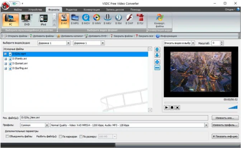 Хорошее приложение с большим набором функций. Если вы много работаете с видео, оно вам точно пригодится. Форматы для конвертации можно выбирать, исходя из типа устройства. В VSDC можно не только быстро конвертировать видео и аудио в высоком качестве, но и редактировать файлы – например, укорачивать видео, вырезать из него фрагменты или склеивать несколько файлов в один.