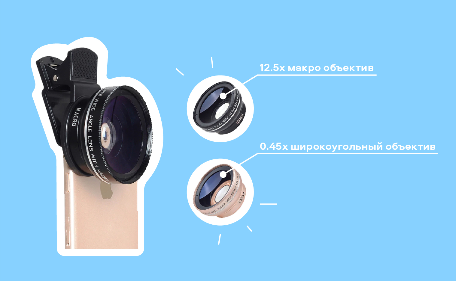 Чаще всего внешние линзы крепятся на камеру телефона с помощью пластиковой прищепки. Также они могут держаться на магните или накручиваться на специальный чехол. Один набор из трех-четырех таких линз можно купить за 500-1000 рублей на AliExpress. Не слишком высокая цена – и огромные просторы для творчества!