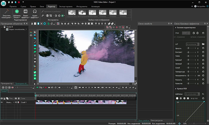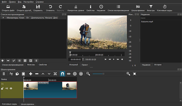 Хороший функционал и надежность — так можно в двух словах описать эту программу. Кроме стандартного набора вырезания и склеивания, есть еще масса опций. Можно захватывать видео с экрана или даже камеры телефона, есть возможность полноценной работы с аудио: фильтры, изменение длины, измерение пиков и кривизны волны. Ещё радует встроенная база эффектов и небольшой набор инструментов для улучшения качества видео: например, стандартная цветокоррекция. Есть функция работы с альфа-каналом – например, чтобы наложить субтитры. Программа поддерживает почти все актуальные видеоформаты, в том числе 4К.