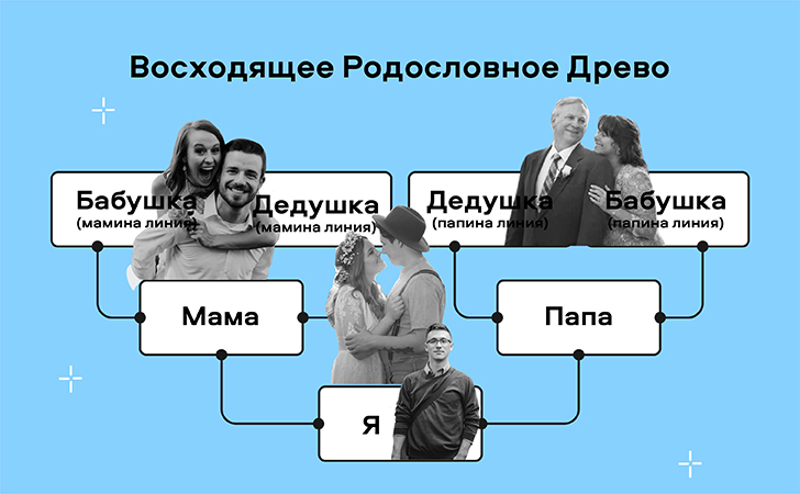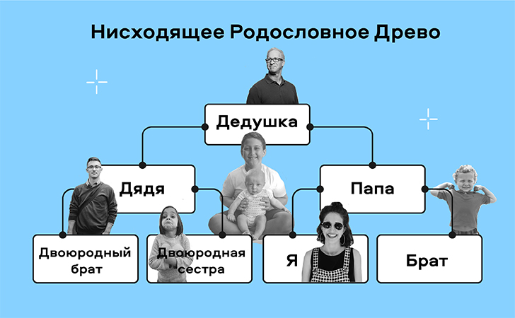 Схема семьи формируется от предка к потомкам. Такой способ оформления позволяет наглядно проследить историю рода с отдаленных времен до наших дней.