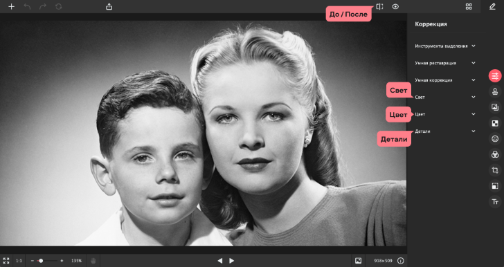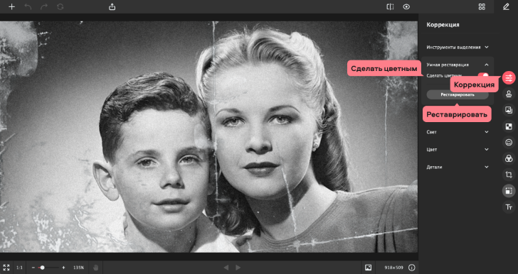 2) Если вы хотите отреставрировать фотографию, потерявшую вид от старости, откройте изображение в программе. Во вкладке Коррекция на панели справа выберите опцию Вручную. Раскройте блок Умная реставрация. Если нужно сделать из черно-белых фотографий цветные, активируйте переключатель Сделать цветным. Нажмите кнопку Реставрировать. Фотографии будут автоматически отреставрированы.