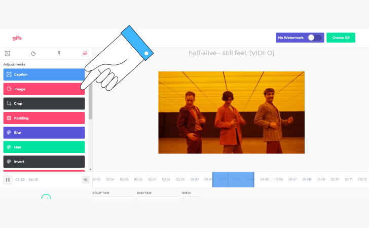 - В открывшемся окне выберите нужный отрезок видео и нажмите Create Gif. Откроется окно, где можно задать название, теги и настройки приватности. Водяной знак можно убрать, если оплатить премиум-доступ к сервису за $10. Если вас не смущает маленький логотип в углу гифки, этот пункт можно пропустить.