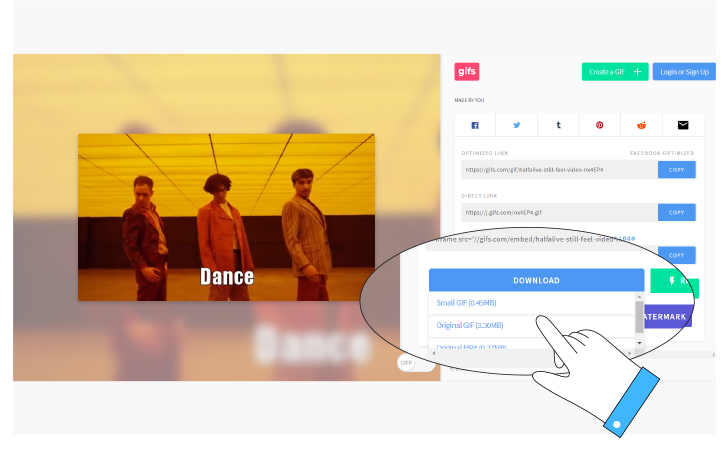 - Затем нажимаем “Download”, чтобы скачать получившийся файл. Сервис запрашивает регистрацию для этой опции, но можно сделать по-другому: открыть в новом окне ссылку из поля Direct Link и скачать гифку прямо из браузера.