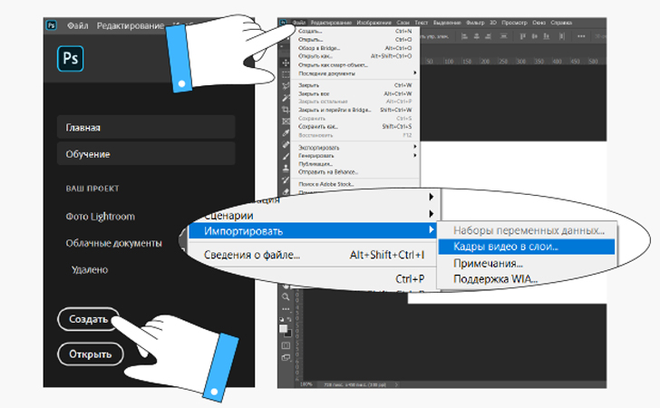 - Создайте новый файл и откройте меню “Файл” в верхнем левом углу страницы. Выберите Импортировать->Кадры видео в слои…