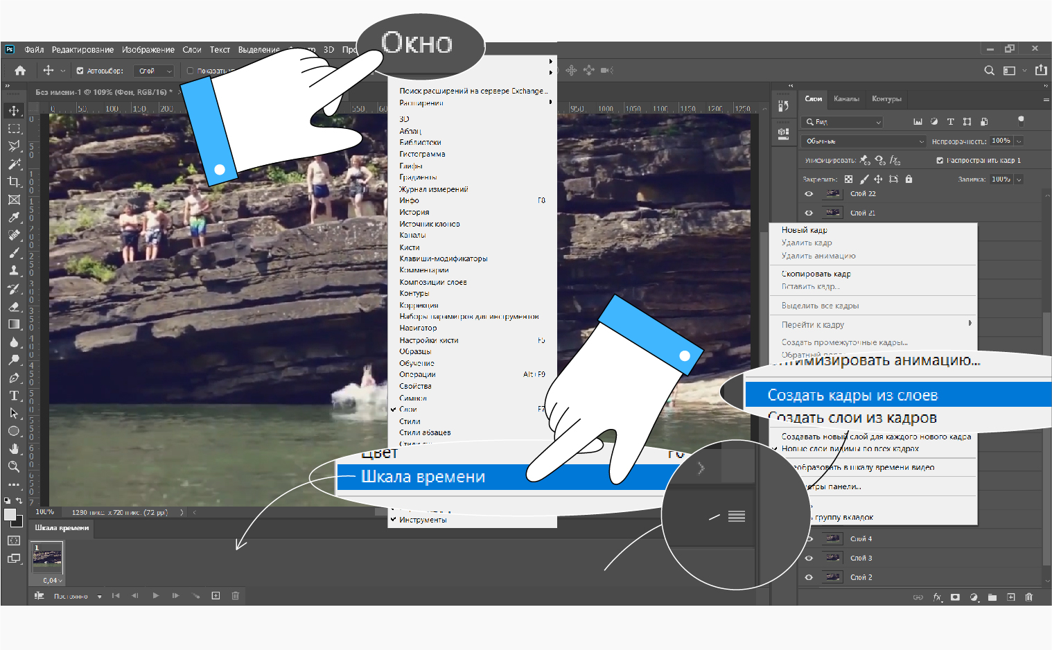 - В панели “Окно” открываем таймлинию и по необходимости редактируем кадры.