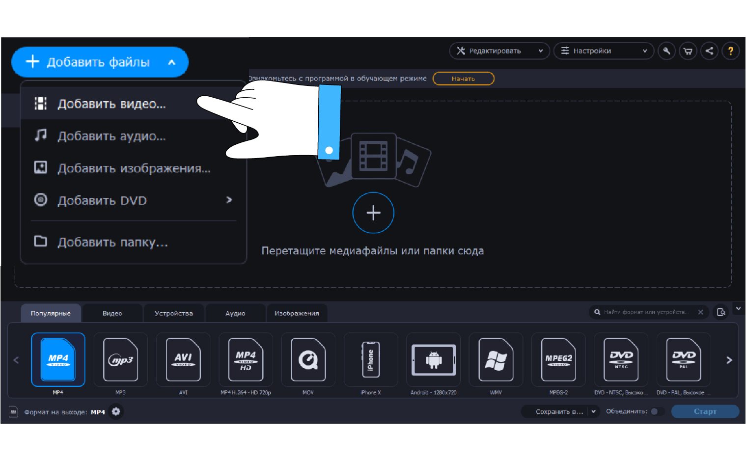 - Откройте программу и загрузите нужные материалы, кликнув по кнопку “Добавить файлы” в верхнем левом углу.