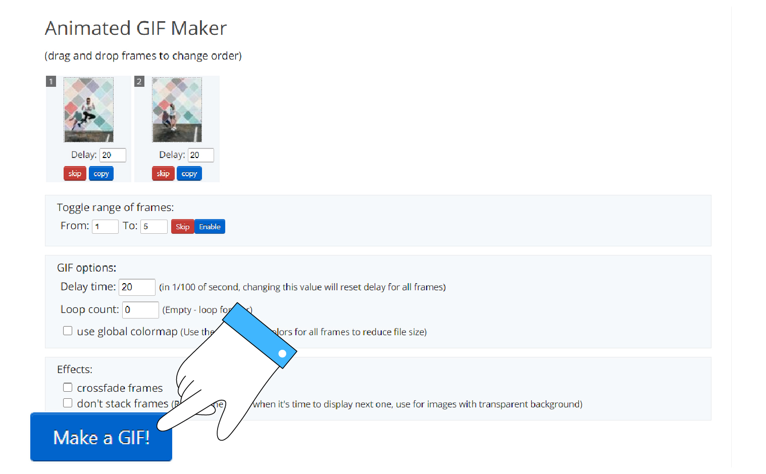 - Перейти на сайт сервиса и загрузить фото, из которых вы хотите создать GIF.