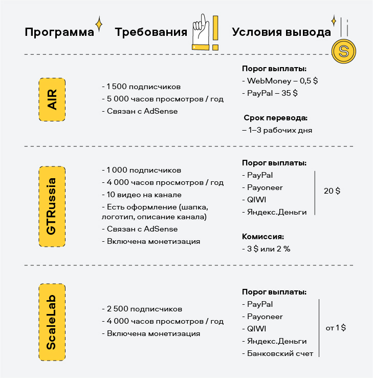 Чтобы не разбираться самостоятельно с выплатами и правилами, можно воспользоваться услугами партнерских медиасетей YouTube. Эти компании помогают блогерам не только в организационном плане (с выводом денег, например), но и делятся советами по оптимизации и продвижению. Делают они это, естественно, не бесплатно: блогер получает только 20-40% от дохода с рекламы. При партнерстве с YouTube напрямую вы забираете себе 55%.