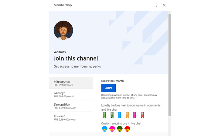 Стоимость подписки на спонсорство стоит для зрителей от 25 до 3799 рублей в зависимости от уровня (вы сами определяете количество уровней на своем канале). Автор контента получает 70% от каждой транзакции. Подписаться на спонсорство зрители могут как с декстопной версии YouTube, так и с телефона.