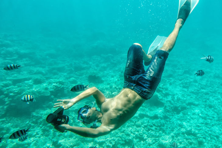Старайтесь искать новые решения. Например, попробуйте нырнуть поглубже и направить объектив не вниз, а наверх – так, чтобы в кадр попадали рыбы и растения. Картинка сразу изменится! Или попробуйте сделать главным героем видео не подводную флору и фауну, а себя. Для этого вам пригодится монопод. «Селфи-палка», впрочем, может оказаться полезной не только для селфи. Ее можно использовать как раз для того, чтобы взять ракурс «снизу».