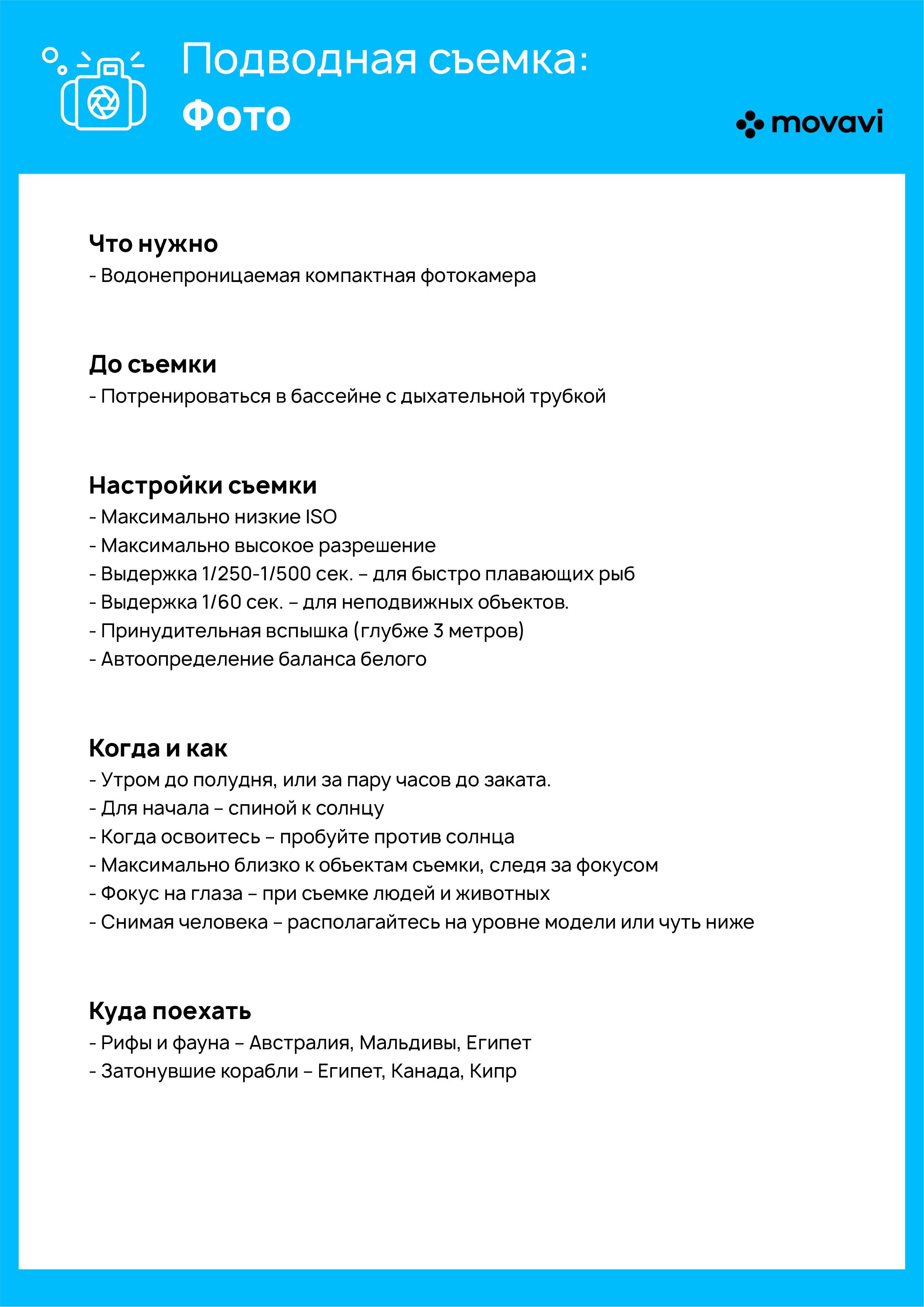 Когда используете вспышку (без этого не обойтись уже на глубине 3-4 метров), ставьте ее в режим принудительного срабатывания и установите автоматические определение баланса белого. Если снимаете без вспышки, баланс белого нужно настраивать вручную, иначе все фото получатся в голубом оттенке. Но это всегда можно исправить и после съемки, на компьютере, с помощью программы для ретуши. Например, для таких целей отлично подойдет Фоторедактор Movavi – он позволит вам быстро разобраться, что к чему, и сделать снимки еще красивее.